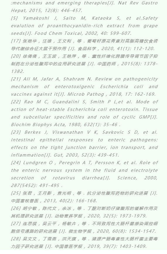 目前,人醫(yī)或獸醫(yī)上已使用的治療分泌性腹瀉藥物有洛哌丁胺、奧太曲、吩噻嗪、氯丙嗪、格列本脲、口服補液鹽(ORS)、消旋卡多曲等。其中,洛哌丁胺、ORS、消旋卡多曲應用最廣。原花青素則是 FDA 批準用于抗分泌腹瀉的新藥 [17,25]。